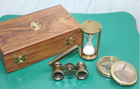 Ahşap Kutulu Pirinç Pusula,kumsaati,dürbün Seti 15682