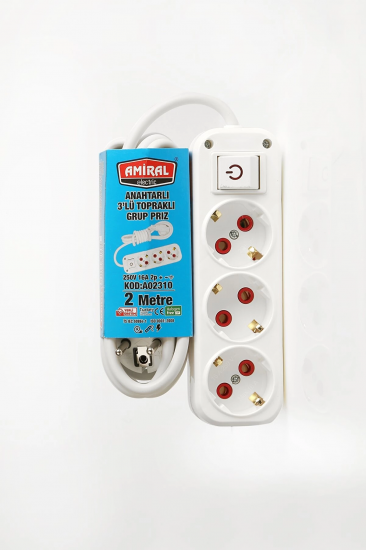 Amiral 3' Lü Topraklı Anahtarlı 2 Metre Kablolu Grup Priz
