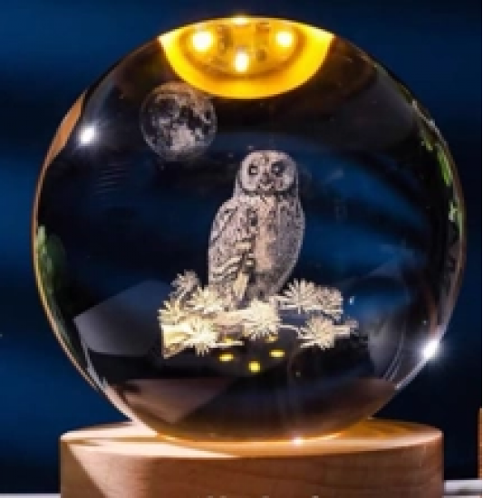 Dekoratif Baykuş Tasarımlı Ahşap Altlıklı Işıklı Cam Küre Büyük Boy 8cm