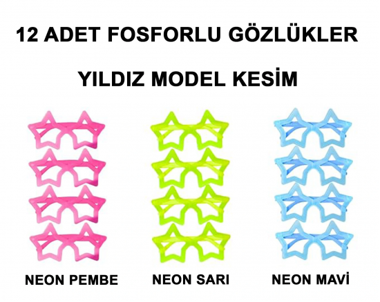 Etiketler: Fosforlu Yıldız Model Glow Parti Gözlüğü Karanlıkta Yanan Gözlükler 12 Adet