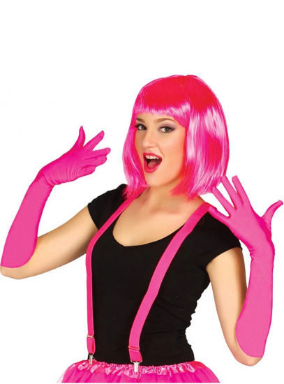 Fuşya Renk Saten Uzun Eldiven Ve Küt Parti Peruğu