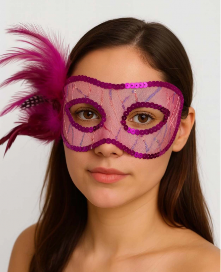 Fuşya Renk Yandan Tüylü Pul Payet İşlemeli Parti Maskesi 23x12 Cm