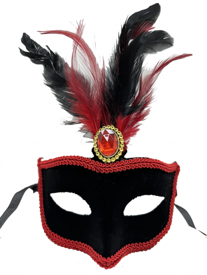 Kırmızı Dantelli Siyah Kırmızı Tüylü Siyah Süet Kaplama Parti Maskesi 17x25 Cm
