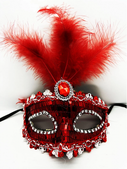 Kırmızı Renk Payetli Pullu Tüylü Parti Maskesi 17x20 Cm