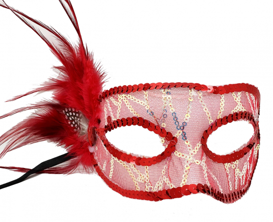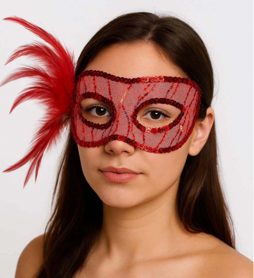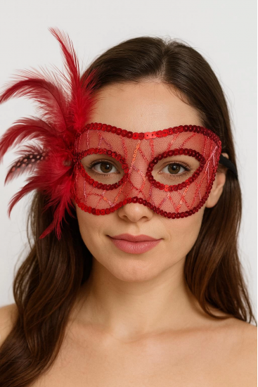 Kırmızı Renk Yandan Tüylü Pul Payet İşlemeli Parti Maskesi 23x12 Cm