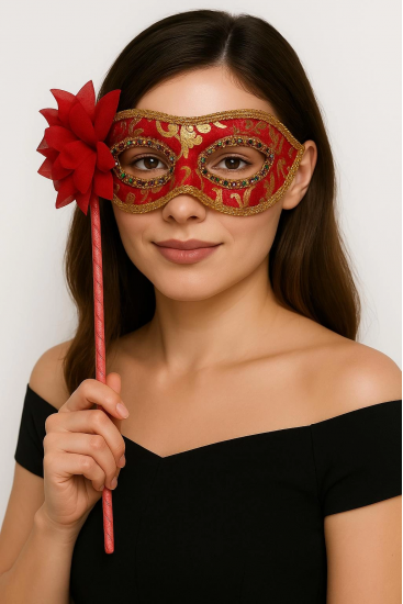 Lüks Taşlı Saplı Maskeli Balo Maskesi Kırmızı Renk 35 Cm