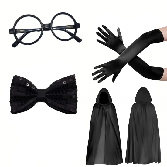 Siyah Kapüşonlu Büyücü Ve Cadı Pelerin Kostüm Seti (4 Parça)