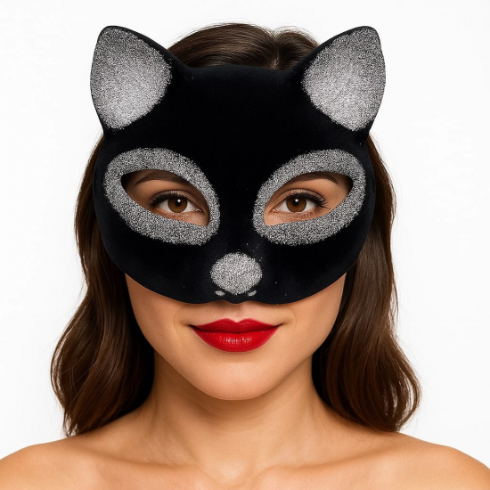 Siyah Renk Gümüş Simli Süet Kaplama Kedi Maskesi 18x14 Cm