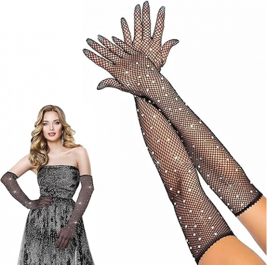 Siyah Renk İncili Elmas İşlemeli File Örgü Uzun Eldiven 45 Cm