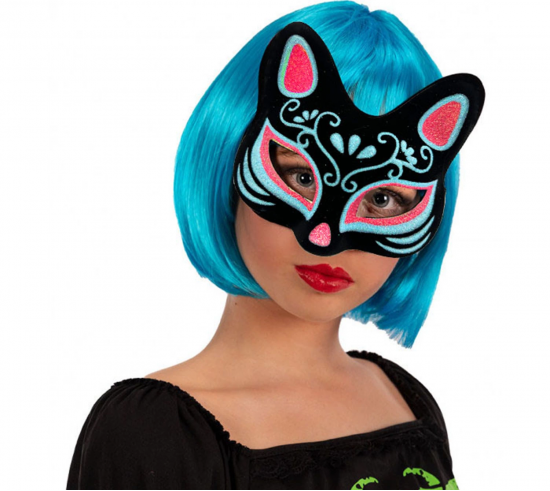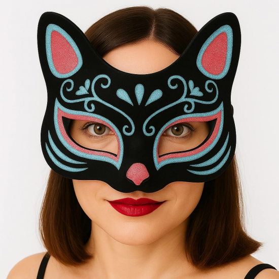 Siyah Renk Süet Kaplama Üzeri Mavi Kırmızı Simli Kedi Maskesi 17x14 Cm