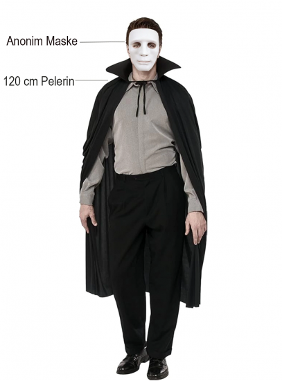 Siyah Renk Yakalı 120 Cm Pelerin Ve Beyaz Anonim Maske